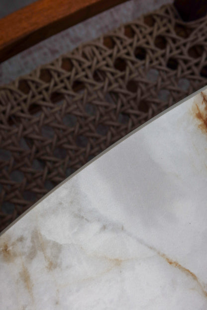 Kleur: Terra coating onderstel en marmerlook blad wit met grijs en terra