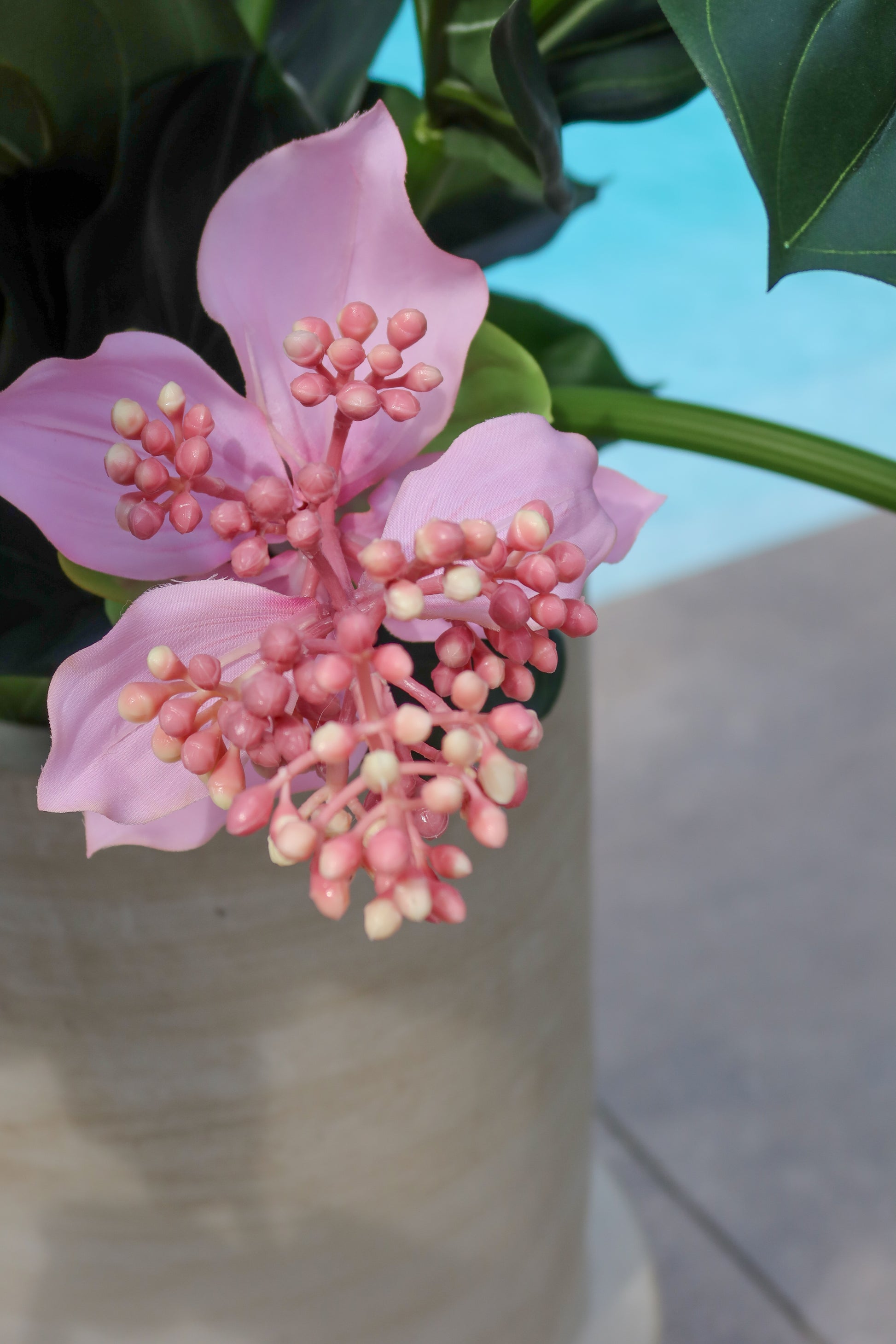Prachtige, door de verfijnde details niet van echt te onderscheiden Medinilla. Onderhoudsvriendelijk en altijd in bloei. Excl. pot.