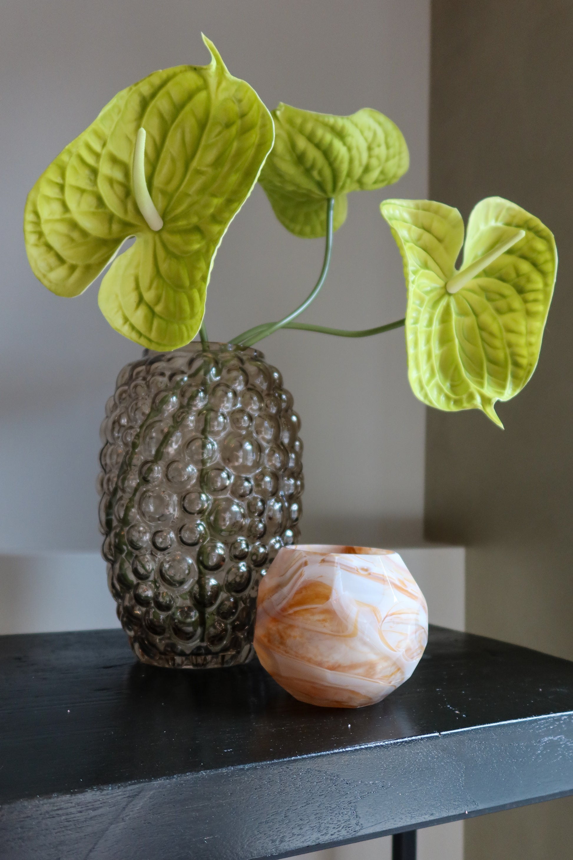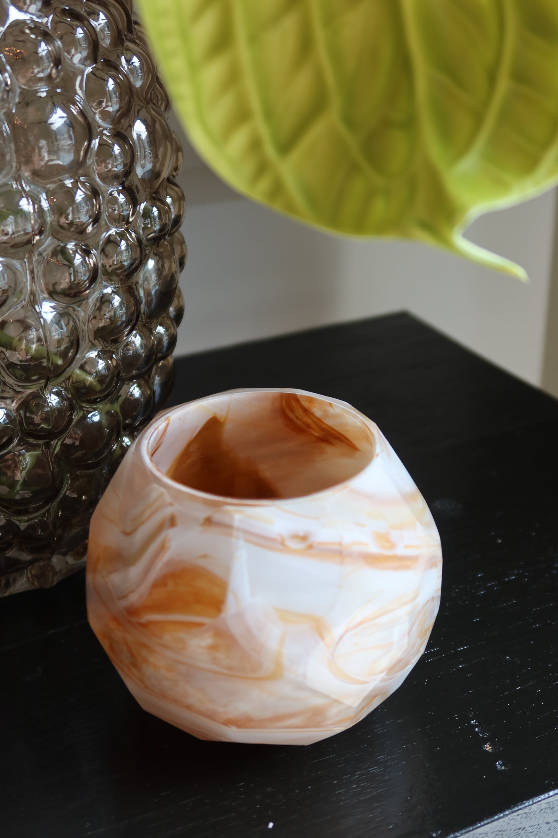 Sfeervol theelicht van glas in marmerlook, gemêleerde kleuren: okergeel/wit/beige. Ieder theelicht is uniek en daarom kunnen kleurstellingen net iets afwijken van de afbeeldingen. Excl. lichtbron