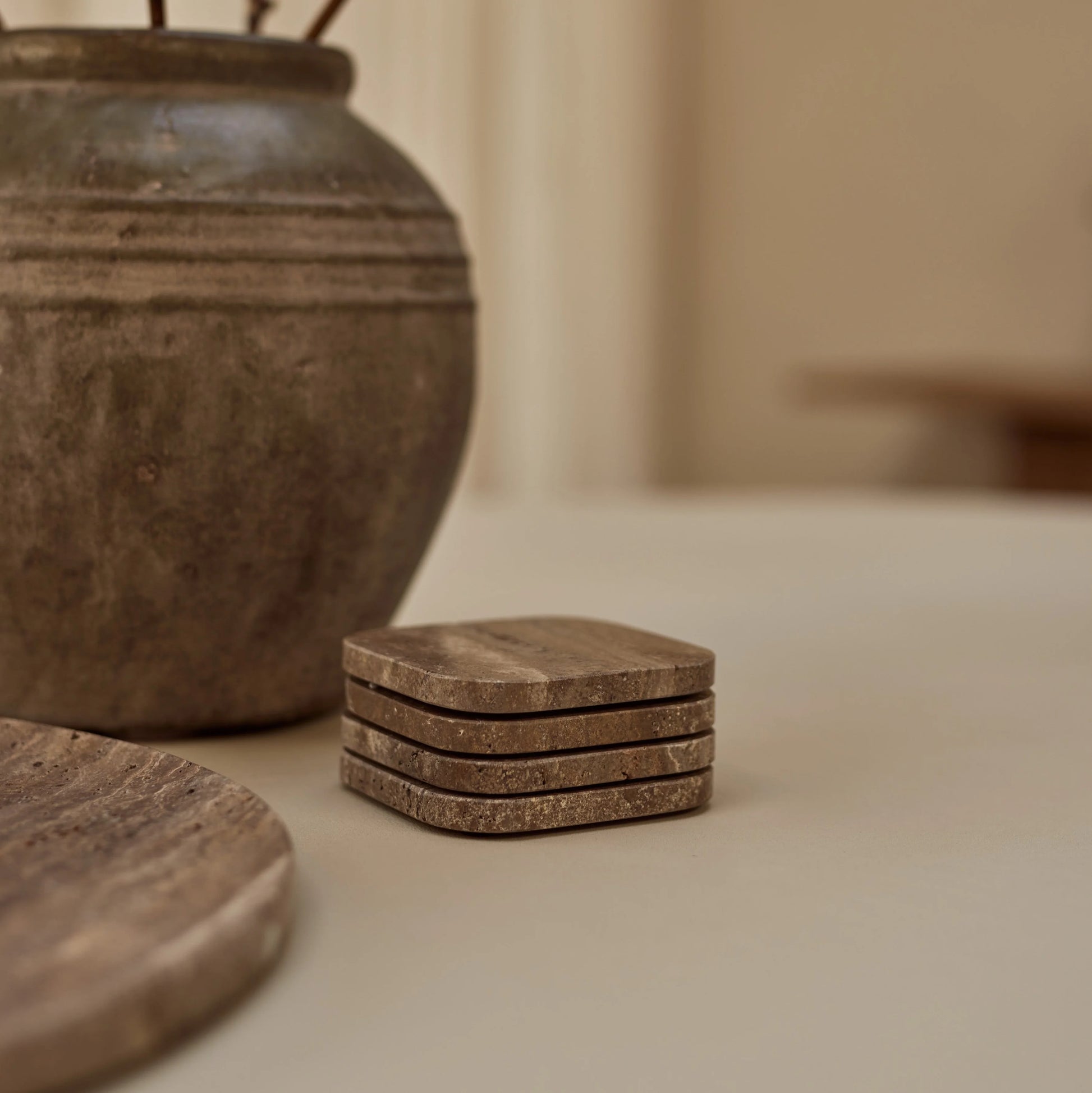 Travertine is een prachtig natuurlijk gesteente dat bekend staat om zijn unieke textuur en warme kleuren. Onze onderzetters worden met zorg vervaardigd uit hoogwaardig travertine, wat resulteert in duurzame en stevige onderzetters die lang meegaan.
