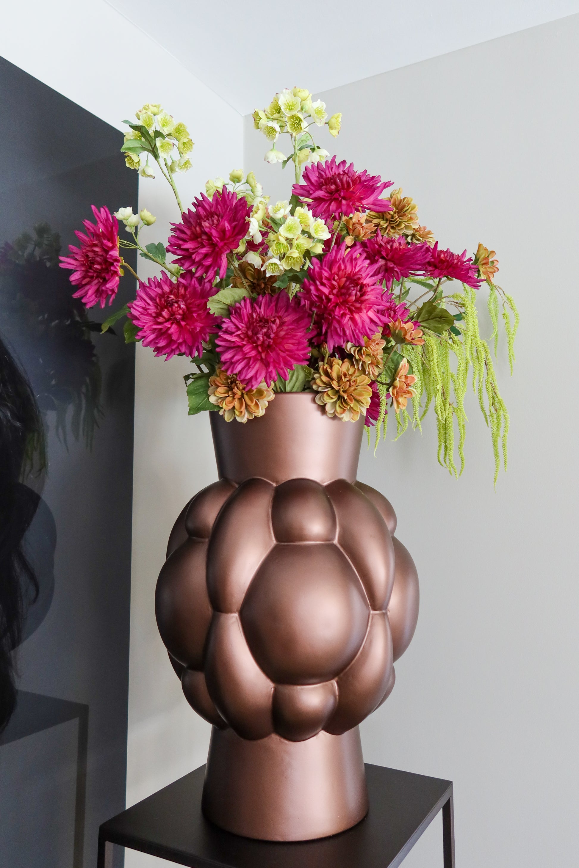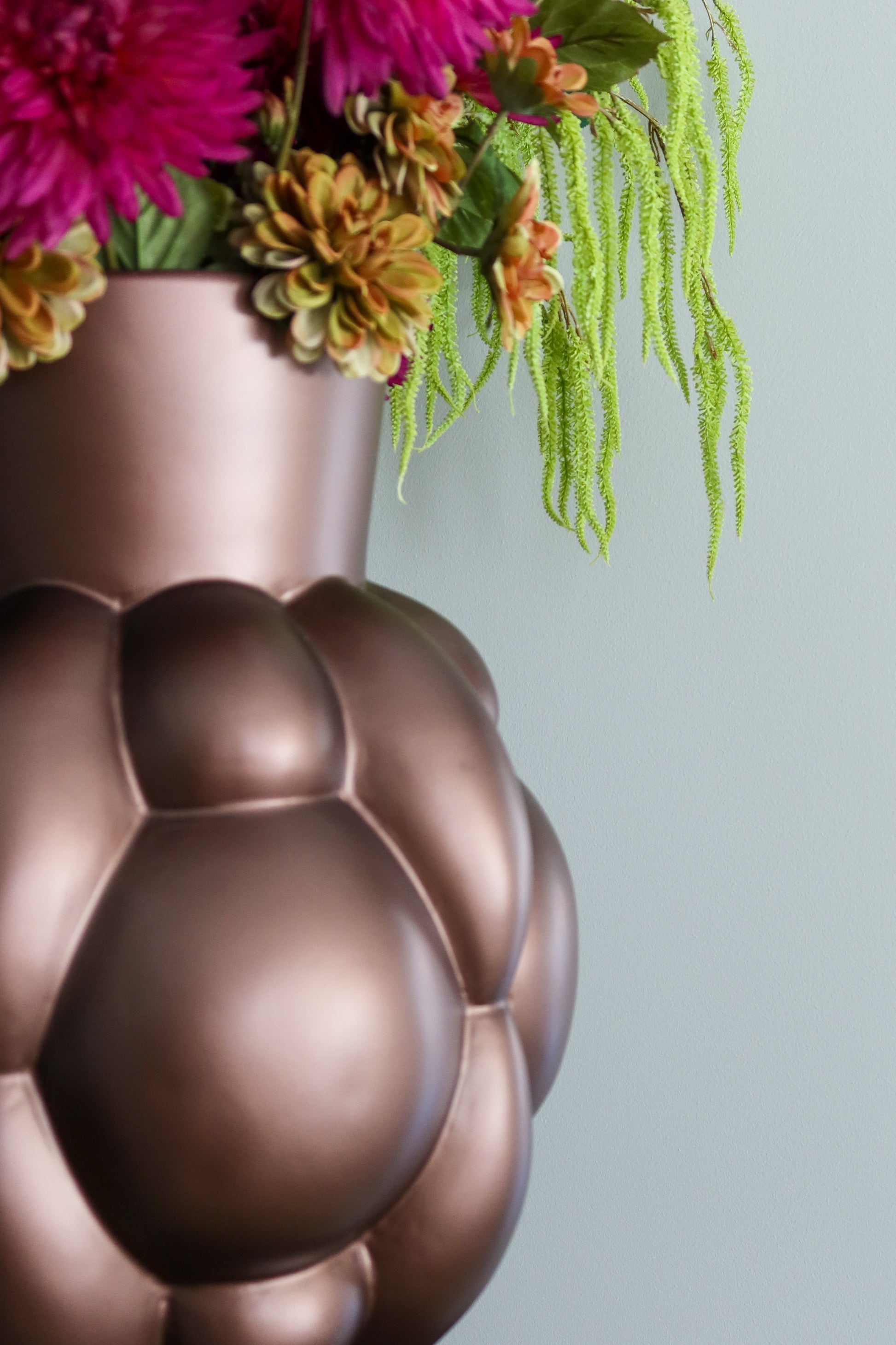 Een echte eyecatcher is deze bronskleurige vaas met zijn ronde vormen. Past perfect in het aankomende herfstseizoen. Excl. bloemen.
