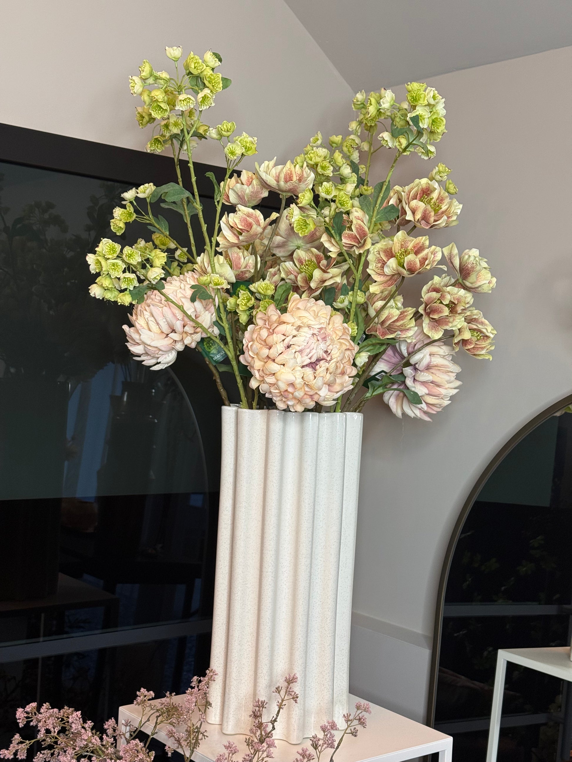 Afmetingen: Helleborus takken 3x 100h, Helleborus takken 4x 78h, Crysant 5x 64h.